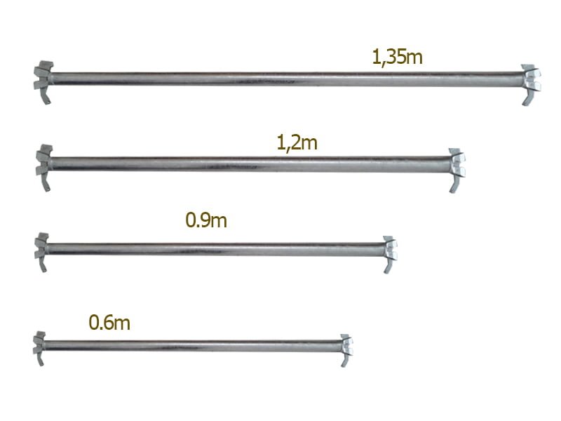 - Thanh giằng ngang Ringlock có nhiều kích thước khác nhau, như 0.6m, 0.9m, 1.2m, v.v., giúp điều chỉnh khoảng cách giữa các cây chống Ringlock sao cho phù hợp với yêu cầu của từng công trình.